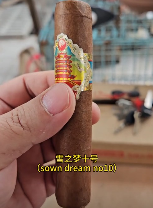 黄鹤楼雪之梦 10 号是湖北中烟工业有限公司在 2020 年推出的。它采用小罗布图型号,每小盒有 4 支雪茄,整条包装是 24 支装。这款雪茄的包装沿用系列标志性翻盖设计,还配备了烫金脚标固定装置,包装细节做得很棒,值得其他国产雪茄参考。