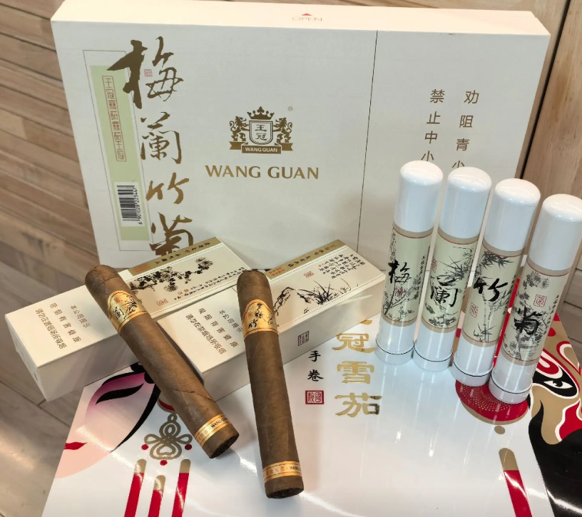 王冠梅兰竹菊雪茄在 2014 年推出,它的外包装以宣纸白为主色,上面有梅兰竹菊水墨画,特别好看。这款雪茄有四个独立主题盒,每盒里面有两支雪茄,还配有航空铝管保护装置。雪茄是圆头平尾的造型,茄衣是棕色系,标环设计融入了传统文化图案。