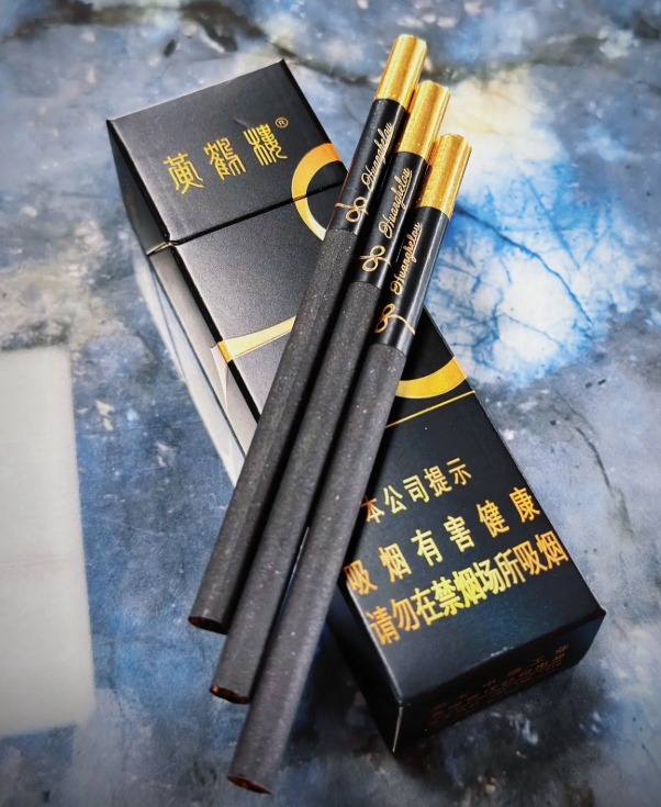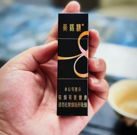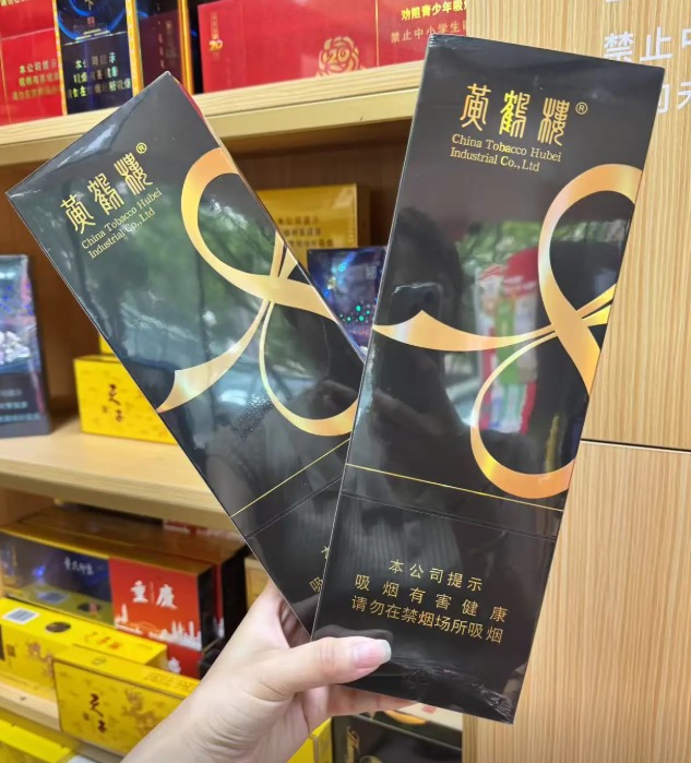 黄鹤楼冰咖采用深棕与米白撞色包装,烟支配备双色滤嘴设计。滤嘴处可见金色"8"字水印,爆珠为冰蓝色。包装盒采用3D立体印刷工艺,盒底设有防伪二维码。