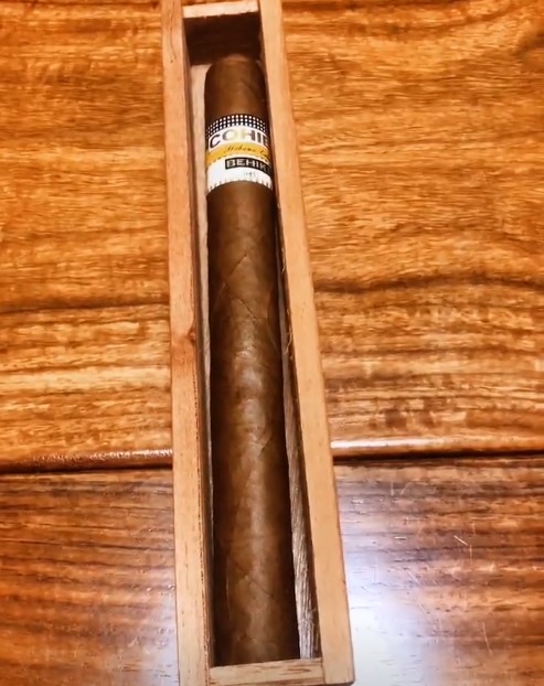 传闻中的800万雪茄原型,疑似古巴国营烟草公司Habanos S.A.为迪拜皇室定制的"Behike之泪"特别版。该产品未列入常规产品目录,采用2010年收获的Vuelta Abajo核心产区medio tiempo烟叶,在El Laguito工厂窖藏十年后,由torcedores 9级卷制师以金箔替代茄衣,茄套掺入22K金粉压制。