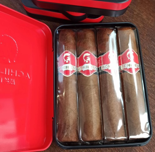 将军战神4号是一款手工制作的半皇冠尺寸雪茄,长度100mm,环径45。这款雪茄采用金属盒包装,每小盒4支售价220元,大盒包含5小盒共20支售价1100元。