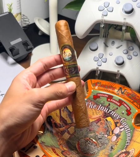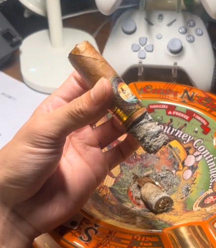 - 前段:点燃后有浓郁的多米尼加风味,烟气顺畅圆润,皮革味明显,能品出坚果、豆子、奶脂、糊米等味道,还有微弱的可可感,辛香和木香凸显。