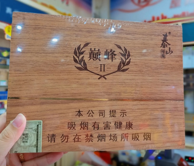 泰山巅峰2雪茄烟丝质地细腻,烟气纯净,口感舒适香醇,抽起来顺滑,不呛口,余味悠长干净有回甜,闻起来舒适,室韵不错,有檀香味,浓郁度中等,劲头适中,无辛辣杂气,尾段无明显劣感。价格较高,前半段的皮革味偏明显,前半段吃味丰富但清晰度不足,偏混沌,后半段吃味特征性上升,易识别但吃味类别减少。