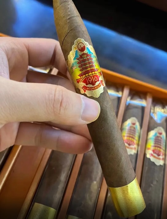 黄鹤楼雪茄起源于1899年宜昌茂大卷叶烟厂,2016年推出高端1916系列,雪之梦6号是其中代表产品。该雪茄融合三峡溶洞恒温发酵与朗姆酒浸润工艺,烟叶选自美洲(多米尼加、巴西)与亚洲(印尼、海南)地区,部分原料为神农架生态烟叶。烟叶经过三次发酵和三年窖藏,全程手工卷制,不添加香精香料。