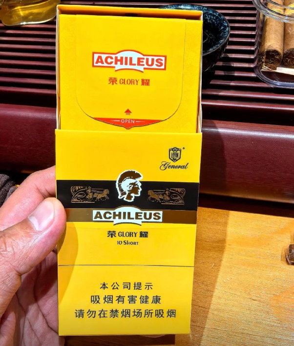包装灵感源自古希腊战神阿基琉斯头像,黄色主色调搭配战神LOGO,阳刚且富有荣耀感。外盒为抽拉式设计,结合90度折盖结构,细节精致。每支雪茄独立玻璃膜包装,保持干净卫生与稳定湿度,方便携带与分享。