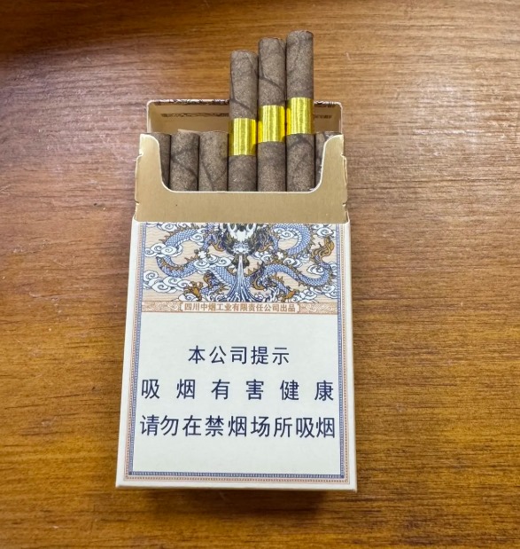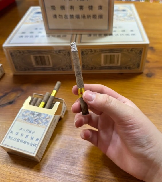 这款雪茄采用亚光硬盒包装,抽屉式结构很别致。烟支是棕黄色茄衣,油润度不错,拿手里有分量。金色镶红五星的茄标挺醒目,25mm的植物纤维过滤嘴设计很中式。