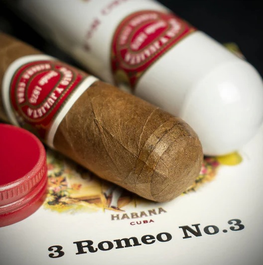 罗密欧与朱丽叶3号雪茄是古巴罗密欧与朱丽叶品牌旗下的一款手工雪茄,该品牌创立于1875年,是雪茄界历史悠久且受认可的品牌之一,以生产优质雪茄闻名。罗密欧与朱丽叶3号雪茄采用来自Vuelta Abajo地区的古巴烟叶混合而成,填充烟叶至少经过两年陈化,茄衣和捆绑叶的陈化时间更长,这样的陈化过程让雪茄口感更为顺滑。