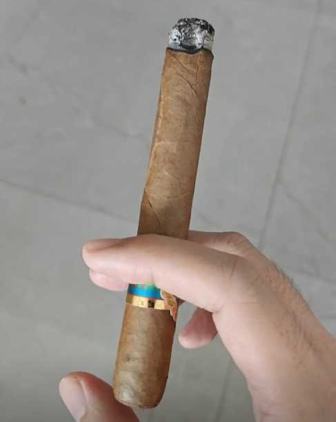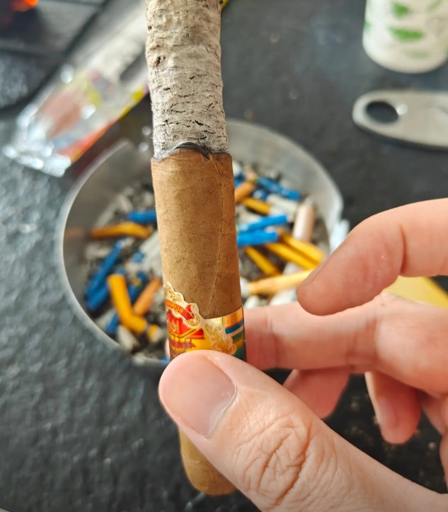 后段有烤杏仁与咖啡基调,尾段玫瑰花香气显著,豆香、可可香交融混合,柠檬酸口中带西柚的一丝苦感唤起味蕾。但焦油积累影响末端体验,苦味随着焦油逐渐增强,不过皮革味依旧保持,烟味收尾清爽,烟气饱满绵长,余味纯净持久。