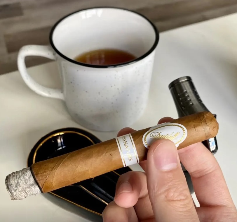 烧到中段,咖啡和烤杏仁味出来了,奶油质感增强,甜味更明显。烟气量适中,燃烧稳定,烟灰灰白色不散落。愉悦感强,适合慢品。