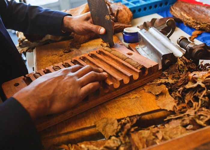 按配方混合不同部位的茄芯叶,手工折叠成束并压实。我觉得这个步骤很关键,直接影响雪茄的燃烧均匀性。