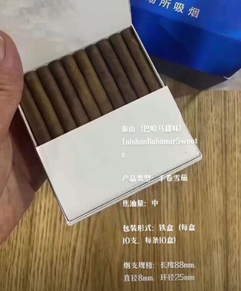 泰山小雪茄采用白底蓝纹铁盒包装,部分版本使用鳄鱼皮纹压花工艺。烟支外裹深褐色茄衣,接装纸印有烫金品牌标识,茄体采用直筒平切造型。