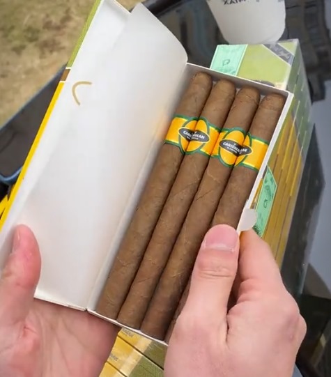 - 包装:黄色和绿色撞色设计的金属盒,烟盒尺寸约15cm×8cm,侧翻开盒设计搭配内部提拉小耳,每盒10支装