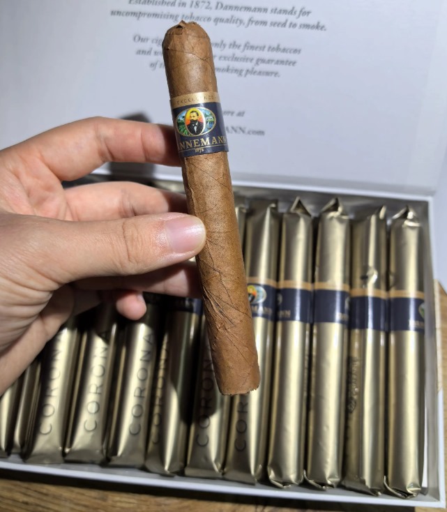 丹纳曼告朗拿(Corona):这是我常买的口粮款,25支装约1200元,单支143mm长度,环径42。口感柔顺,带咖啡香气,独立密封包装挺方便。个人觉得前段香气讨喜,但尾段略平淡。