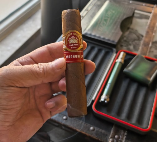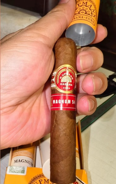玛瑙54是乌普曼系列中唯一采用铝管密封设计的型号。铝管以金色与深棕为主色调,印有泰诺印第安人头像全息防伪标,底部标注生产批次与日期。铝管内衬雪松木片,兼具便携与保湿功能。茄衣为深红褐色马杜罗叶,油润光泽,叶脉细腻,卷制紧实无明显缝隙。茄标为红金配色,印有“H. Upmann Magnum 54”字样,整体视觉庄重典雅。