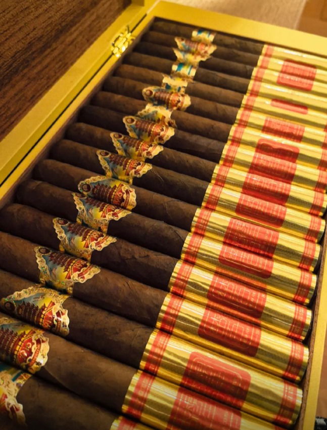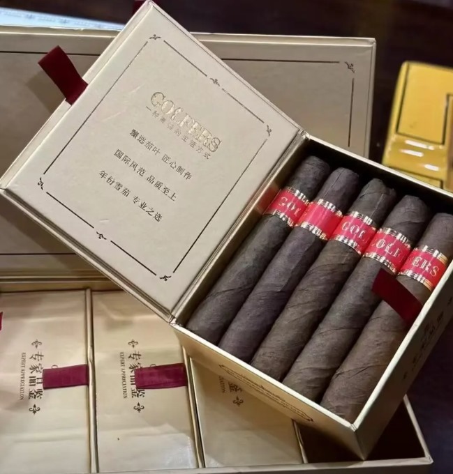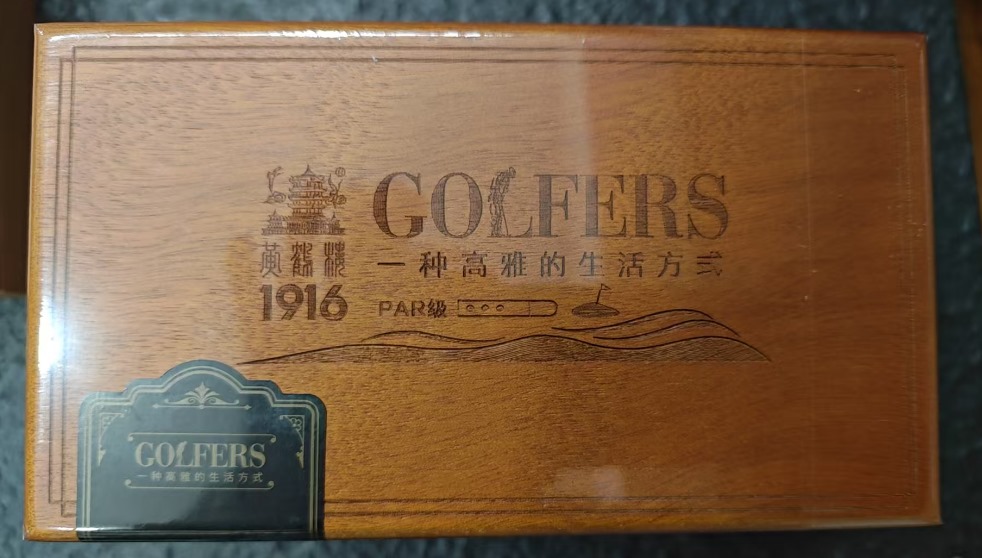 礼盒用金色或黑色航空铝管,高端款配雪松木保湿盒,盒上印着高尔夫球杆、旗帜这些元素。茄衣深棕色或自然色,表面光滑,茄标橙金配色印“Golfers”字样,部分型号预剪了茄帽,开盒就能抽。