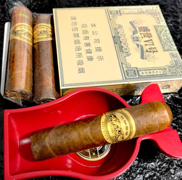今天抽了支长城盛世6号,这是国产手工雪茄,小盒5支装卖120元,算下来单支24块。尺寸90mm长,50环径,小罗布图型号,浓郁度我给3星半,中等偏上。包装是酒红色硬纸盒配金色浮雕LOGO,看着挺精致。号称是"春"派大师刘万春亲自指导,但实际是徒弟卷的,不过卷功确实不错,捏着弹性很好。