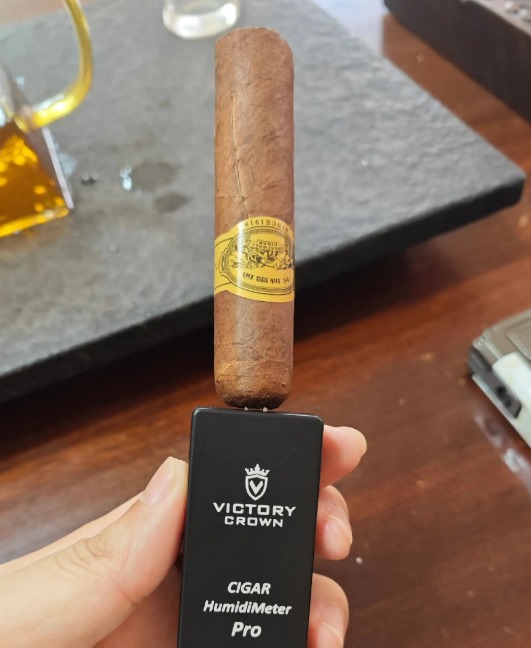 盛世6号是四川中烟的产品,产地四川什邡,用了多米尼加、巴西和四川本土烟叶调配。茄衣是厄瓜多尔苏门答腊烟叶,深红褐色,表面油润光滑。我这款养了半年,闻着有点淡淡的烟草味,还带点酸腐杂味。茄帽是经典"猪尾巴"造型,冷吸时有雪松和烤杏仁香气。