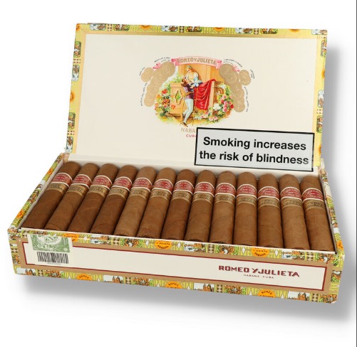 - 标准木盒:最常见的是10支或25支的雪松木盒。盒子主色调是白色配黄色,印着罗密欧与朱丽叶那个经典的彩色人物LOGO,四边还有金色镶边,看起来挺优雅的。盒子外面有防伪标识,里面通常还有一张产品介绍单。