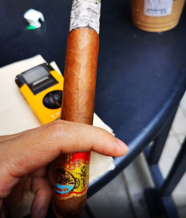 点火后烟气顺滑,木香和坚果味明显,带点白胡椒的刺激感。燃烧很稳,灰白坚挺,豆香慢慢透出来,甜感讨喜。配着拿铁刚好解甜腻。