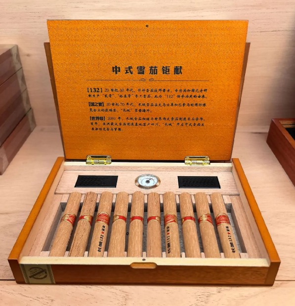 长城132秘制采用高端实木木盒包装,盒身设计简约大气,正面印有红色五角星和“132秘制”字样。盒内配备保湿系统和湿度计,确保雪茄保存环境稳定,湿度约68%。还附赠雪松木片包裹每支雪茄,兼具防护与增香作用。部分版本盒盖内侧印有132小组历史介绍,细节处体现文化传承。