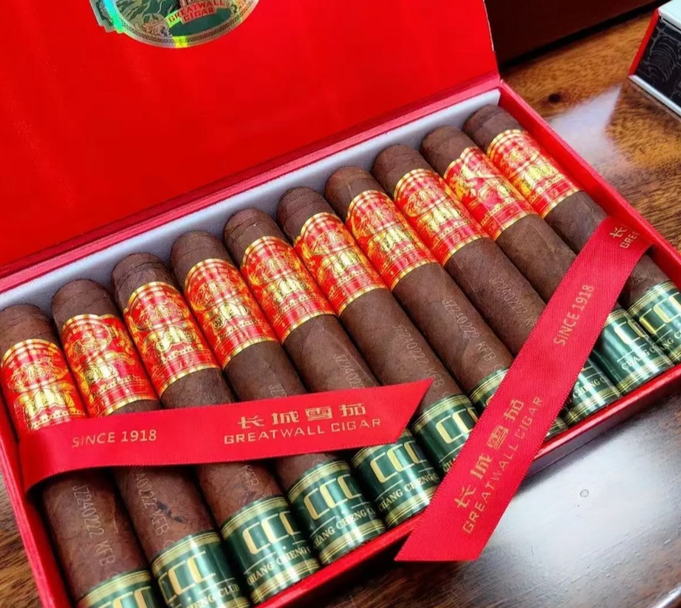 盒身是中国红铁盒,印有金色长城LOGO和五角星,看起来挺复古的。盒内每支都有独立玻璃纸包装,保护得不错。茄体是棕黄色茄衣,色泽油亮,茄帽还有“小辫子”设计,卷工挺紧实的。