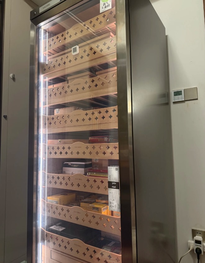 这款德国货的智能系统挺唬人,支持人脸识别和指纹解锁,手机APP就能远程调温湿度。用的是磁悬浮变频压缩机,湿度波动控制在±2%以内,5mm西班牙雪松木内胆防霉驱虫,层架还能灵活调整,适合资深茄客存大量藏品。