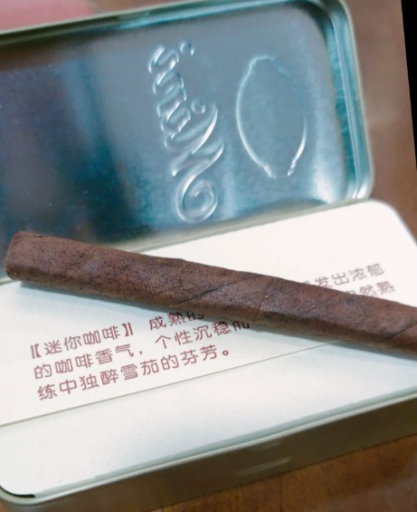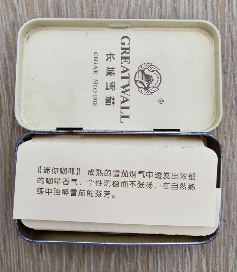 包装是米白色铁盒,搭配黑色标识,简约现代,盒面印有“长城迷你咖啡”字样。铁盒采用铰位结构,密封性好,尺寸约打火机大小,便携。茄衣浅棕色,表面光滑但叶脉略明显,无油润感。无过滤嘴,抽吸端为预切口设计,卷工紧实,茄体纤细。