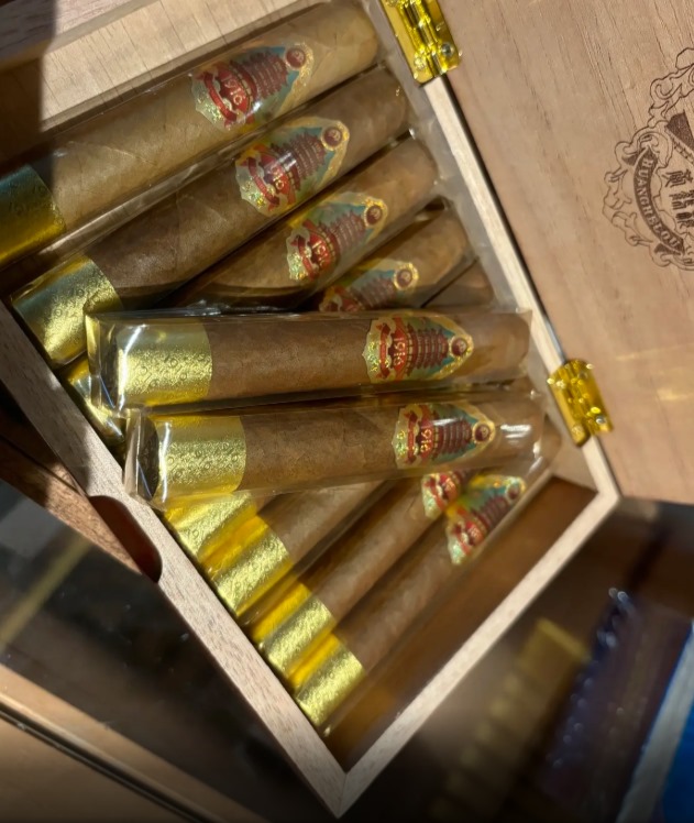 雪茄本身是标准罗布图尺寸,长124mm,环径50,被公认为雪茄界“标准身材”。茄衣精选古巴品种巴西烟叶,油光水亮,卷工扎实。建议调整湿度65.7%左右,养护后表现更佳。