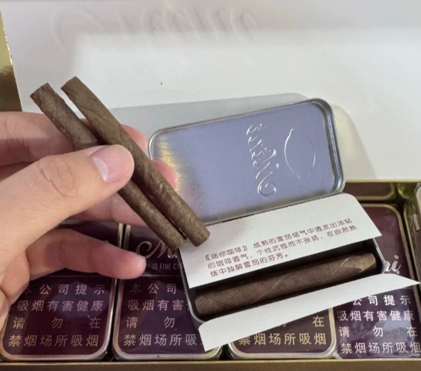 长城迷你咖啡雪茄,这盒10支装才20块钱,绝对是性价比。尺寸是75mm长、21环径的迷你型,机制雪茄但调香够狠。铁盒包装只有巴掌大,开盒就是一股烘焙咖啡豆的味儿,浓郁度中低,适合塞兜里随时掏出来解瘾。