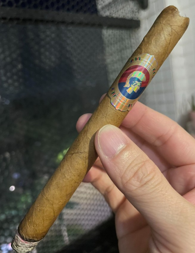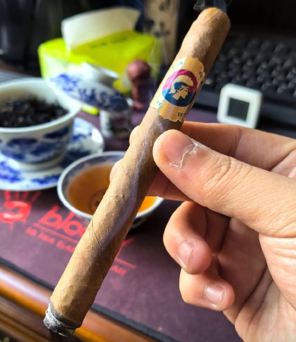 到尾段,木香和皮革味加重,杂气与辛辣感显现,余韵带微苦。燃烧线较稳定,但烟灰结构松散,持灰约2-3厘米。