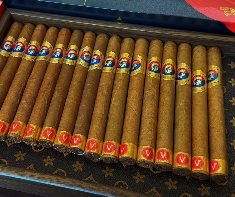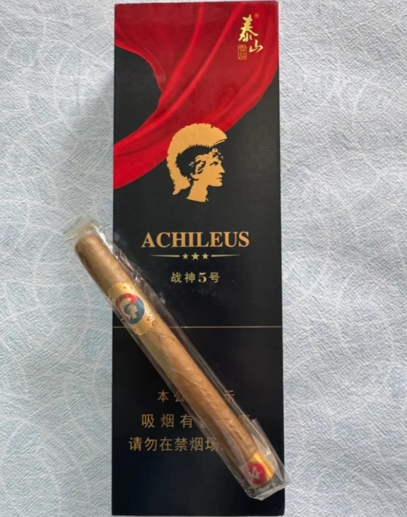 包装红黑配色,盒身印浮雕"战神"标识,每支独立玻璃纸包装。茄衣金棕色,油润细腻,纹理清晰,卷制紧实无硬点。