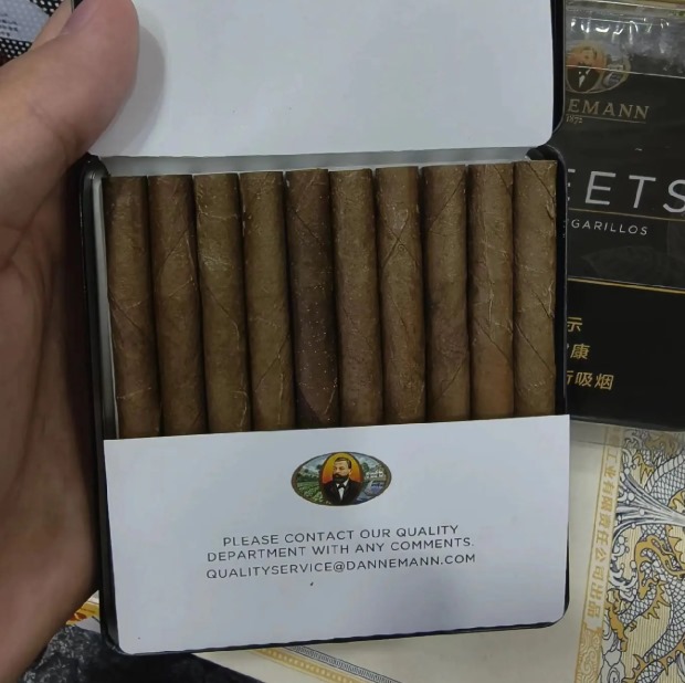 设计上,丹纳曼甜干邑雪茄注重便携和保鲜。常见铁盒包装,每盒10支,方便携带,适合社交场合分享。外观视觉辨识度高,黑金配色为主,烟标用了干邑酵母特殊纸张,遇湿会显现隐形花纹,这种工艺美学我觉得挺有创意的。