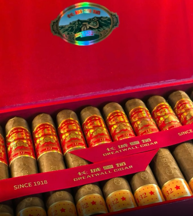包装采用中国红主色调,盒面中央为金色长城浮雕,红黄双色的茄标配色有着根正苗红的132雪茄血统。雪茄茄衣呈深红褐色,表面光滑油亮,叶脉细密均匀。双茄标设计足够正式端庄,粗壮的身材拿在手里很有分量感。
