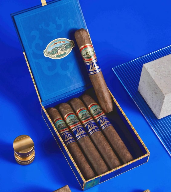 包装以深蓝色硬盒搭配金色40周年标识,部分版本配备智能保湿盒,兼具实用与收藏价值。雪茄茄衣为多米尼加深褐色叶片,表面细腻油润,茄标为长城LOGO与40周年双标组合,整体视觉沉稳大气。