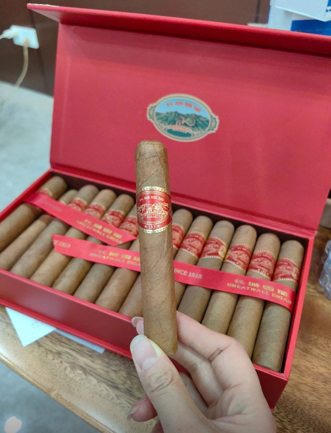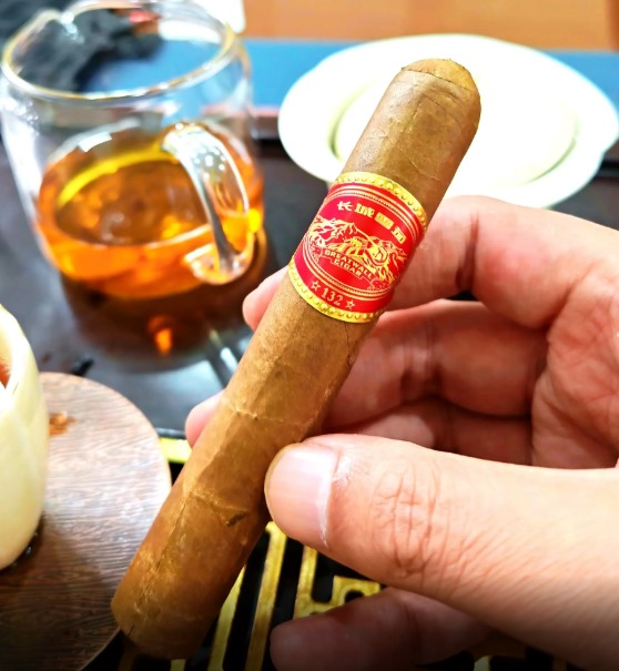 盒身主色调为复古米黄色,搭配红色“长城”LOGO与金色麦穗纹。雪茄茄衣呈深琥珀色,油润光滑,叶脉细腻。采用传统辫状茄帽设计,茄体紧实有弹性,点燃前散发雪松、烤面包与淡淡陈皮香气。