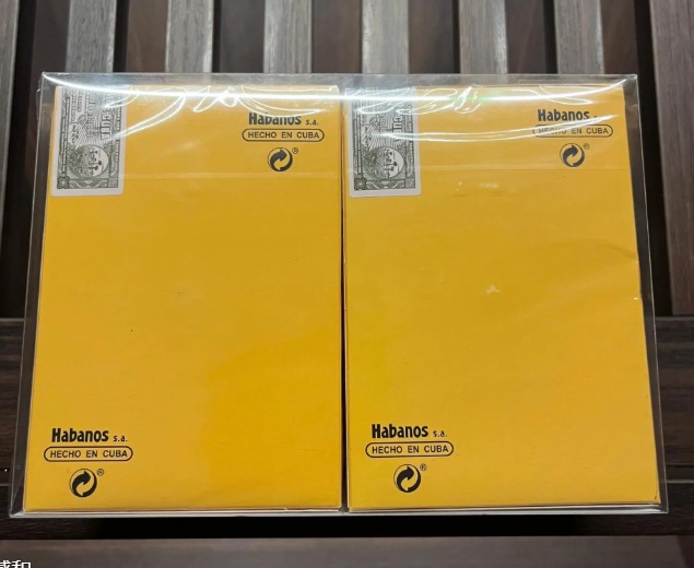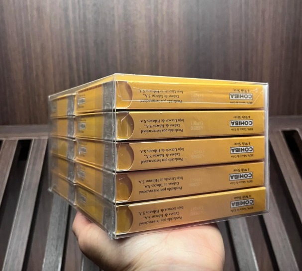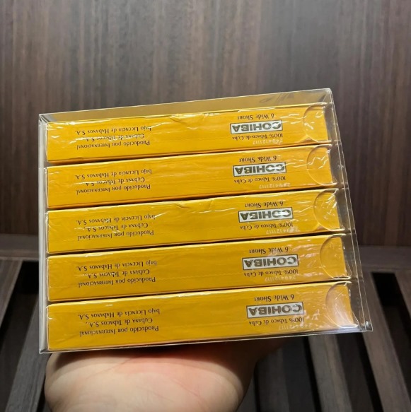 包装采用经典的高希霸黄色木盒,盒面印有金色浮雕标识和防伪全息图。每支雪茄以红白相间铝管独立封装,顶部环标为金色“Cohiba”字样,并配有雪松木片以保持湿度。茄衣为深红褐色(Maduro 色系),表面油润光滑,茄体紧实饱满,末端为圆形切口。