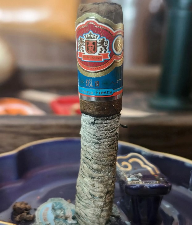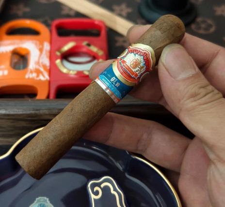 蓝色假日雪茄刚购入时容易出现杂气和氨水味,需静置醇化约三个月以上,风味才能稳定并释放出烤面包和坚果香气。整体燃烧稳定,但部分批次存在斜烧情况。
