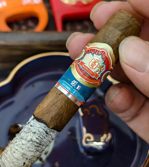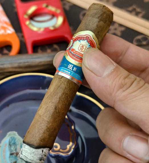 茄衣为深棕色至巧克力色,油润度良好,叶脉细致。茄帽采用三重卷边工艺,切口平整。点燃前可嗅到雪松与坚果气息,伴随轻微甜香。茄体紧实有弹性,抽吸阻力适中,燃烧线直,烟灰灰白且较为稳定。