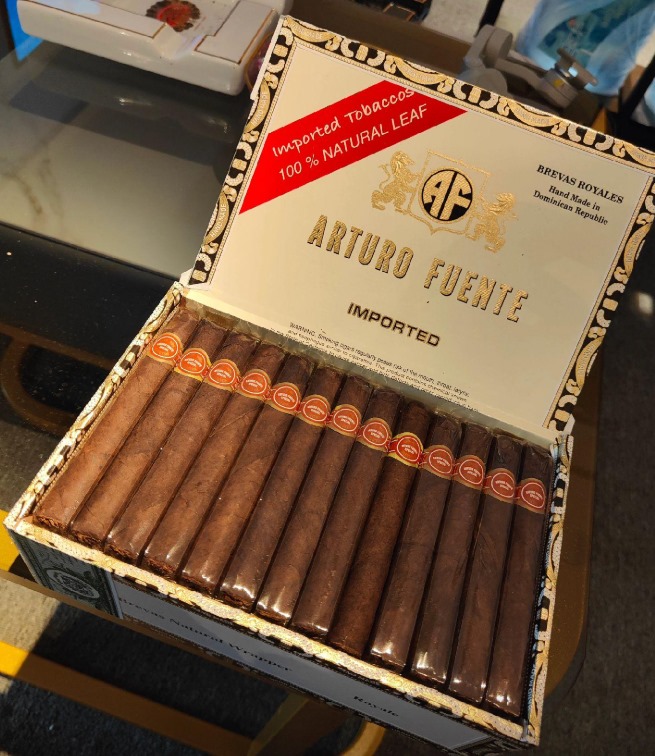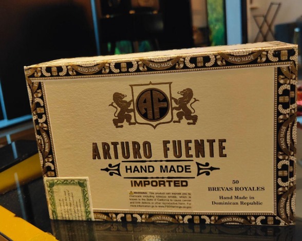 外盒为白色或原木色设计,印有红色与金色品牌徽章,部分型号配备雪松保护套与绿色丝带,典雅大方。茄衣呈深褐色至黑色(Colorado Maduro – Oscuro),油润感强,叶脉明显但不影响美观。茄标采用红色为主调,印有经典 “Fuente” 标识,外观质朴且富有力量感。
