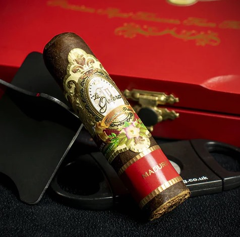 外包装为红色漆面木盒,盒盖内衬黑色天鹅绒并印有金色字体,整体外观显得精致。雪茄本身佩戴主标和标注“Maduro”的副标,茄衣颜色均匀,卷制扎实,脚部填充均匀。
