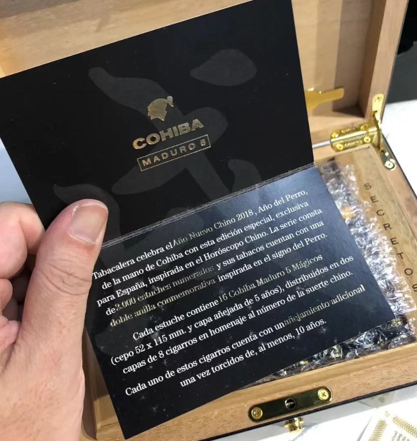 黑色钢琴烤漆木盒重量较大,盒盖有金色生肖狗浮雕。盒内雪茄排列整齐,茄衣呈现油润光泽。茄标采用经典金色设计,附加“戊戌”字样标识。