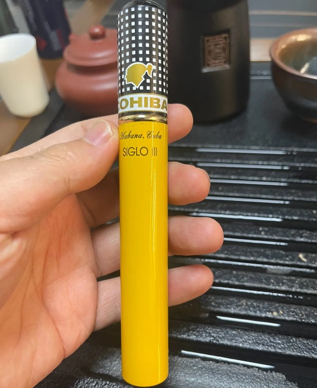 世纪三号沿用高希霸经典的黄黑格纹木盒设计,搭配金色浮雕LOGO与泰诺印第安人头像,极具辨识度。铝管版为红白相间配金色环标,附雪松木片辅助养护。茄衣呈深棕色,油润光泽感强,表面平整无明显叶脉,茄体紧实均匀,手感扎实。