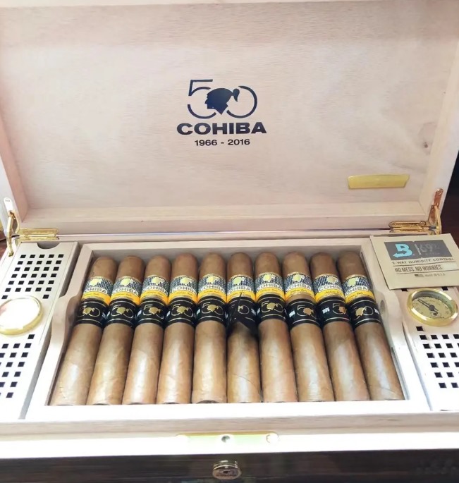 高希霸50周年旅行保湿盒雪茄由古巴哈伯纳斯公司于2016年推出,用以庆祝品牌创立50周年。该限量版保湿盒全球发行10000个,市场售价约25000元/盒,内含8支高希霸代表型号雪茄,涵盖Behike 56、世纪VI、天才(马杜罗5年)以及特级金字塔。此套装兼具收藏属性与实用功能,适合收藏与品鉴。