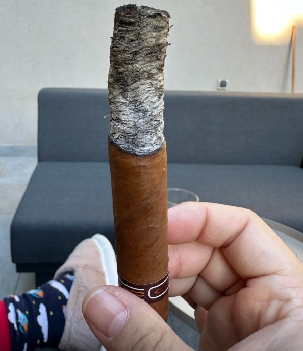 我灰完这根蒙特克里斯托2号雪茄,整体感觉一般。养了一个多月后,茄衣油亮,状态不错。前段味道较单一,木香主导,烟气量不大,吃味是明显的咖啡可可味。中段主线味道浮现,皮革泥土感结合发酵香,花香轻微。尾端复合香味爆出,但焦油感较强,有些锁喉感,需配饮缓解。蒙特2号雪茄尾端尼古丁积累明显,建议提前结束。