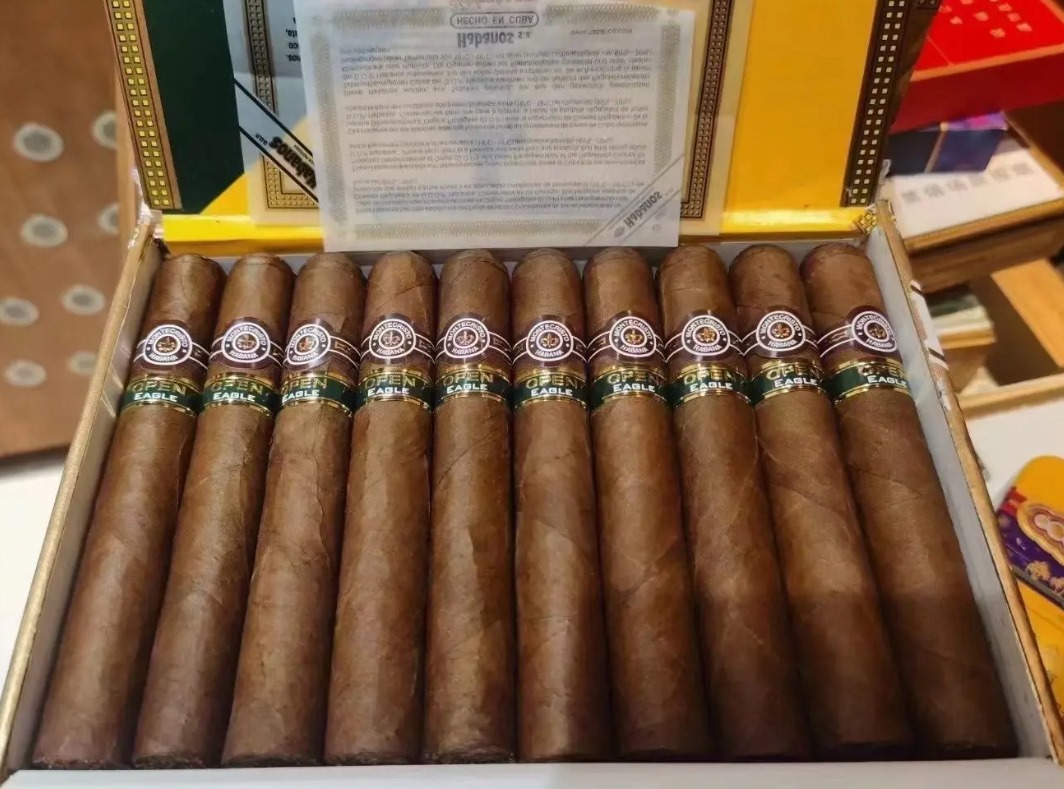 雪茄茄衣呈深棕色,带油光,质地光滑,叶脉清晰。三重帽设计,做工精致。盒装采用黄绿色搭配金色字体,配有红黄色交叉剑Logo,标注“Open Eagle”。部分版本附带绒布袋或独立铝管包装,便携防潮。