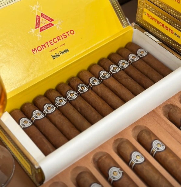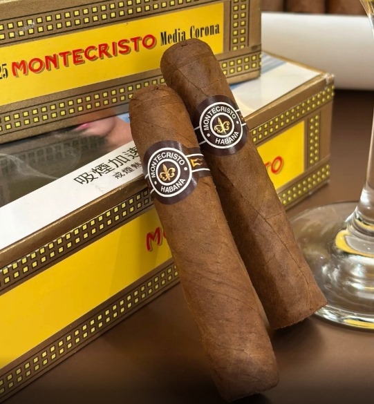 常规款为25支/盒木盒,红黄配色经典设计,盒面印有金色品牌标识及"Media Corona"字样。茄衣为深棕色科罗拉多马杜罗,油光明显,叶脉细腻但偶有轻微凸起。双环标设计,主标为红白金三色相间的蒙特经典标识,副标标注"Media Corona",茄帽采用三重封顶工艺。