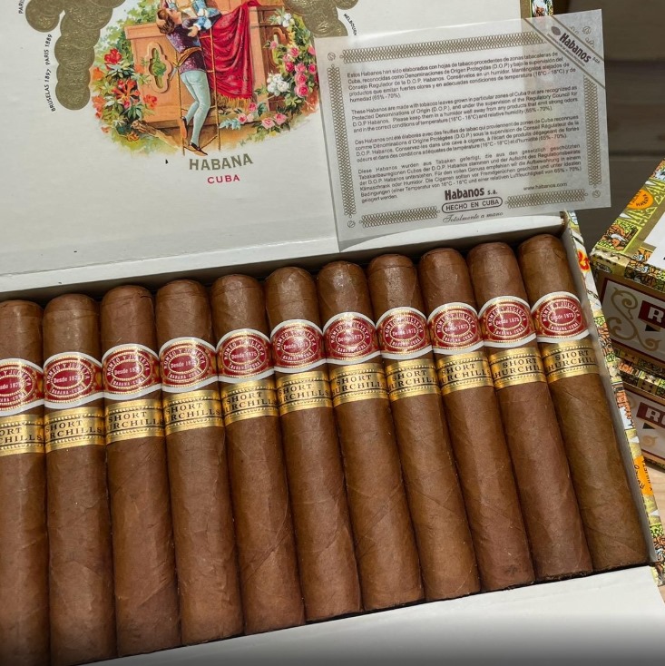 罗密欧短丘吉尔的推出与品牌与英国首相丘吉尔的渊源密切相关。1946年丘吉尔访问哈瓦那时,品牌特意为他定制了7英寸×47环径的雪茄,后以丘吉尔之名流传。短丘吉尔作为2006年的新品,补充了罗布图尺寸的空白,更适合短时间品吸。