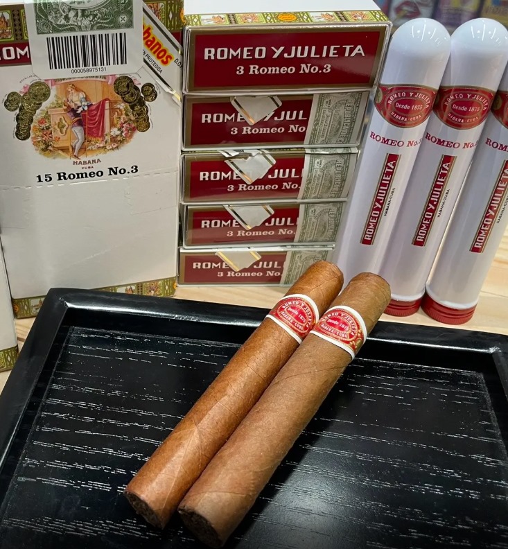 Romeo y Julieta 品牌诞生于1875年,以莎士比亚的经典悲剧《罗密欧与朱丽叶》命名。自2002年起,罗密欧三号采用长茄芯手工卷制,是品牌系列中较短的一款雪茄,以其温和风格和雪松木香而广受欢迎。