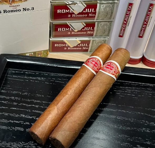 罗密欧与朱丽叶(Romeo y Julieta)创立于1875年,因莎士比亚的同名悲剧而得名,象征浪漫与优雅。早期供应欧洲皇室,1903年被英国商人收购后推向全球。罗密欧3号诞生于20世纪初,属于Corona尺寸雪茄,曾是温斯顿・丘吉尔钟爱的款式之一,以温和口感和雪松香气闻名。