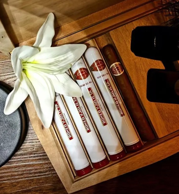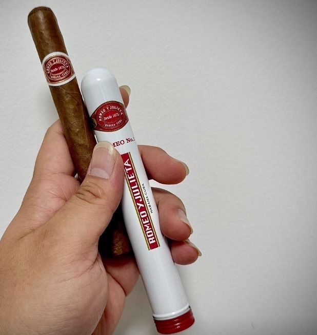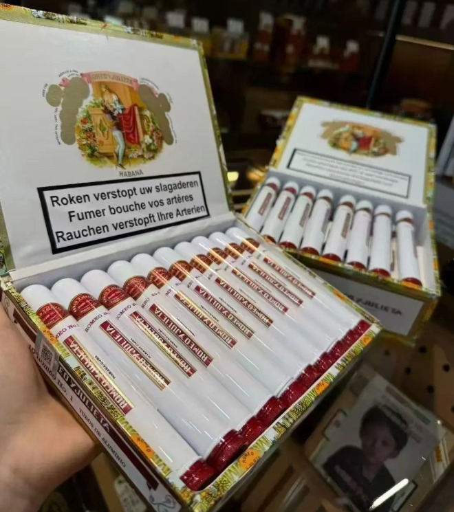 罗密欧一号雪茄(Romeo y Julieta No.1)是古巴哈伯纳斯的经典款,常规版本每盒25支装,价格4280元。尺寸为140mm长度、40环径,烟叶来自比那尔德里奥省Vuelta Abajo产区,浓度中等偏浓郁。采用独立铝管包装,木盒主色调白色配金色标识,设计典雅便携。